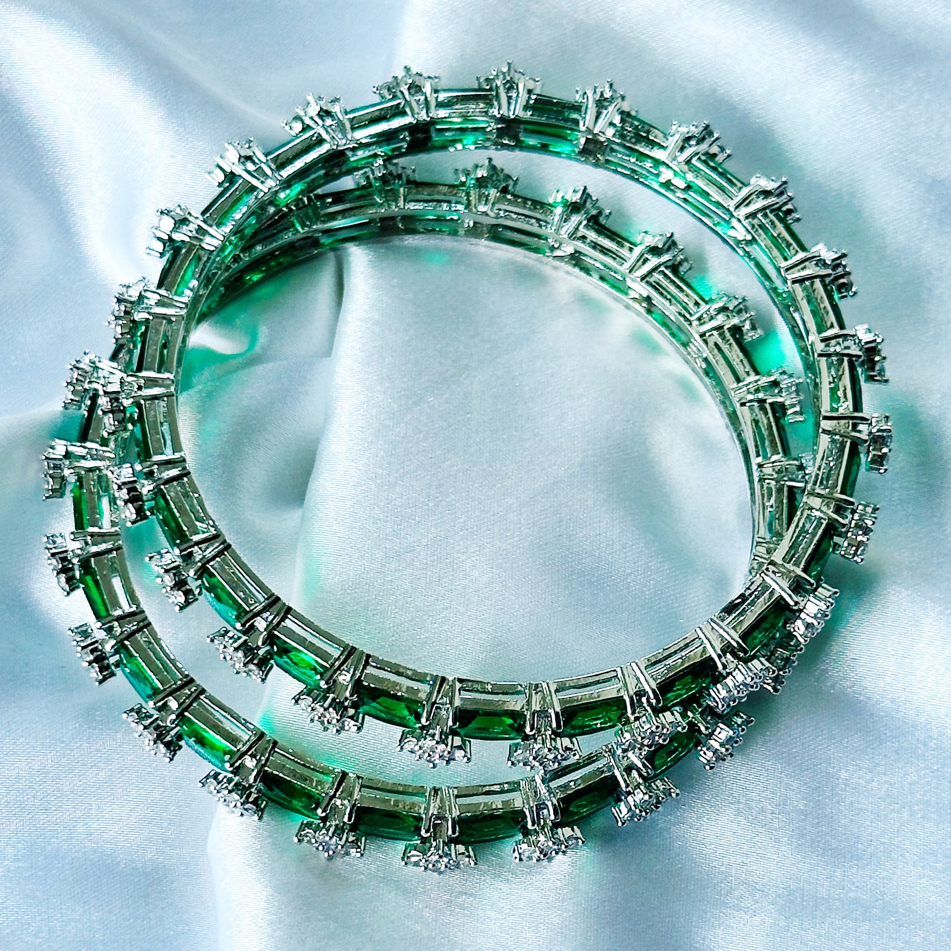 Green Emerald Cubic Zircon American Diamond Silver Plated Bangles, Set of 2
