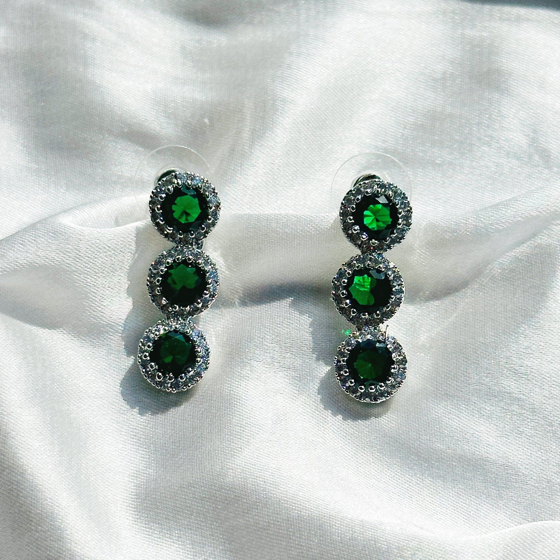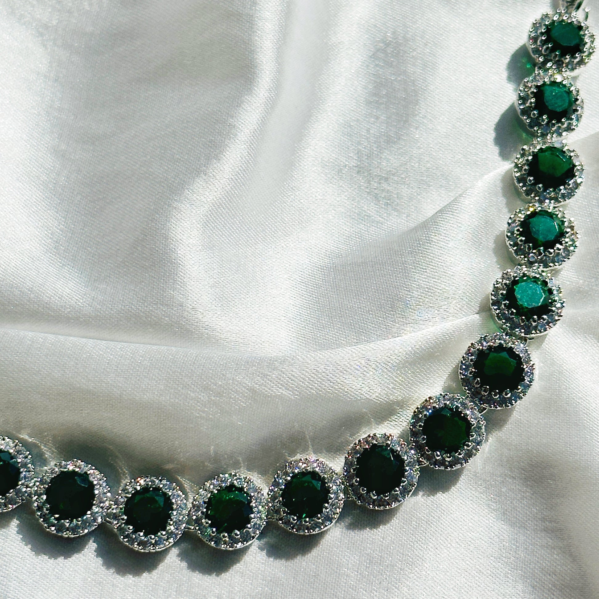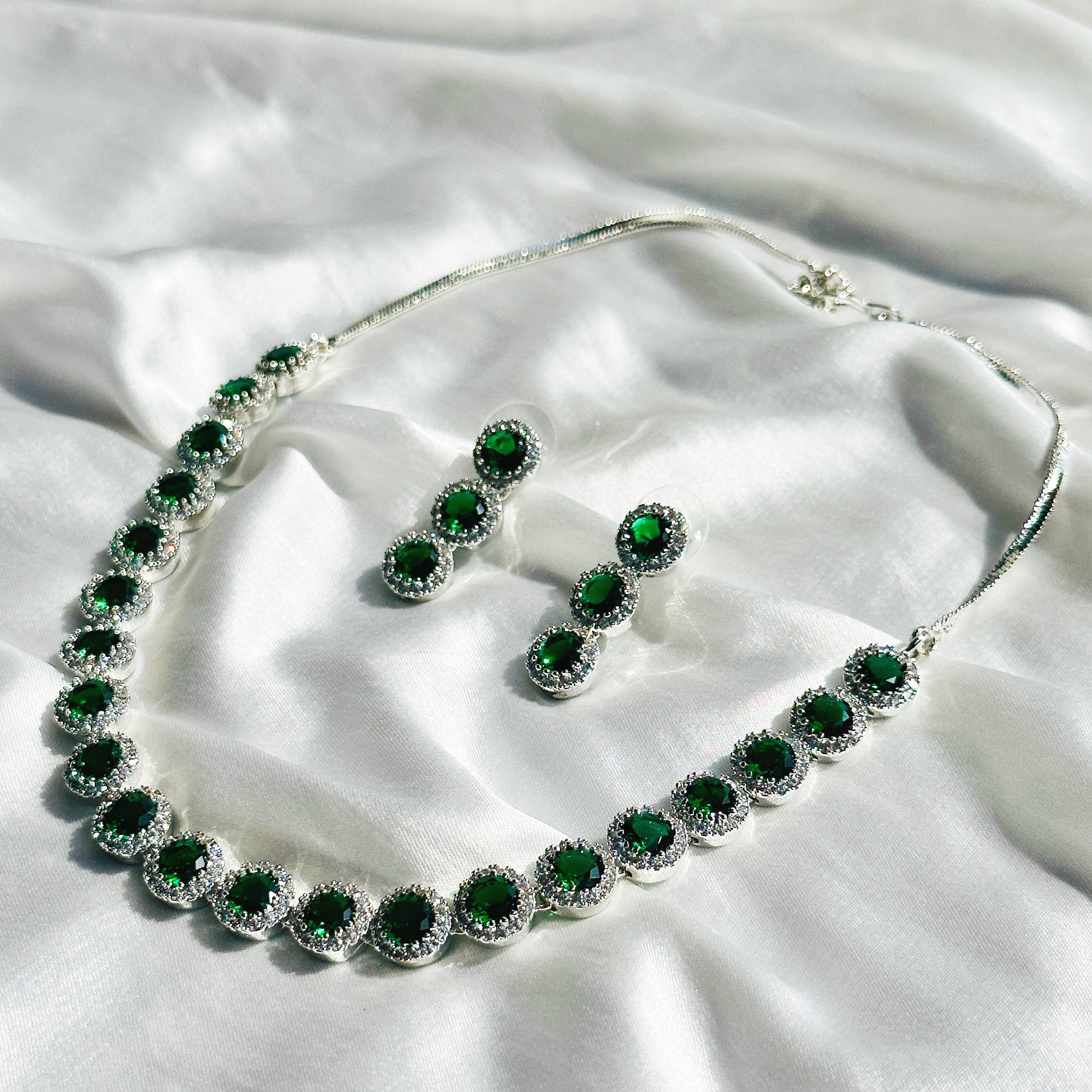 Green Emerald Cubic Zircon Stone American Diamond Silver Plated Necklace Set