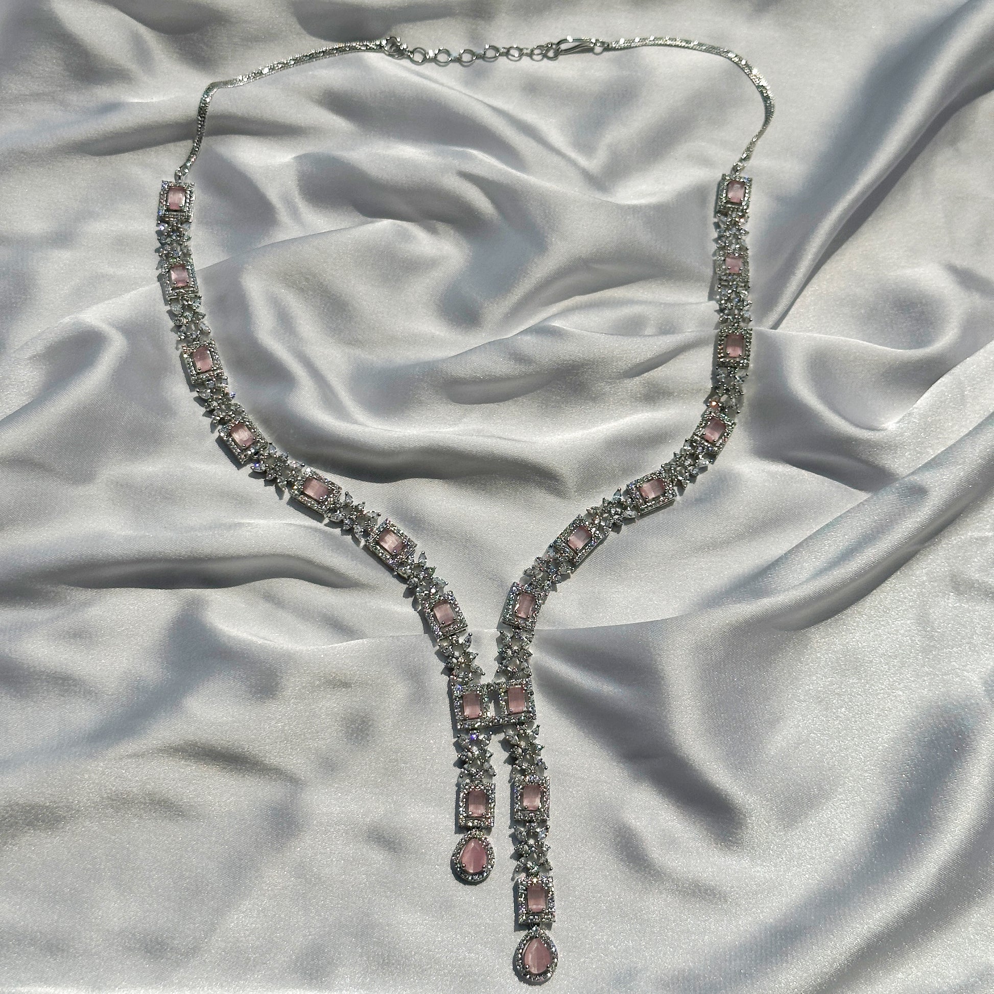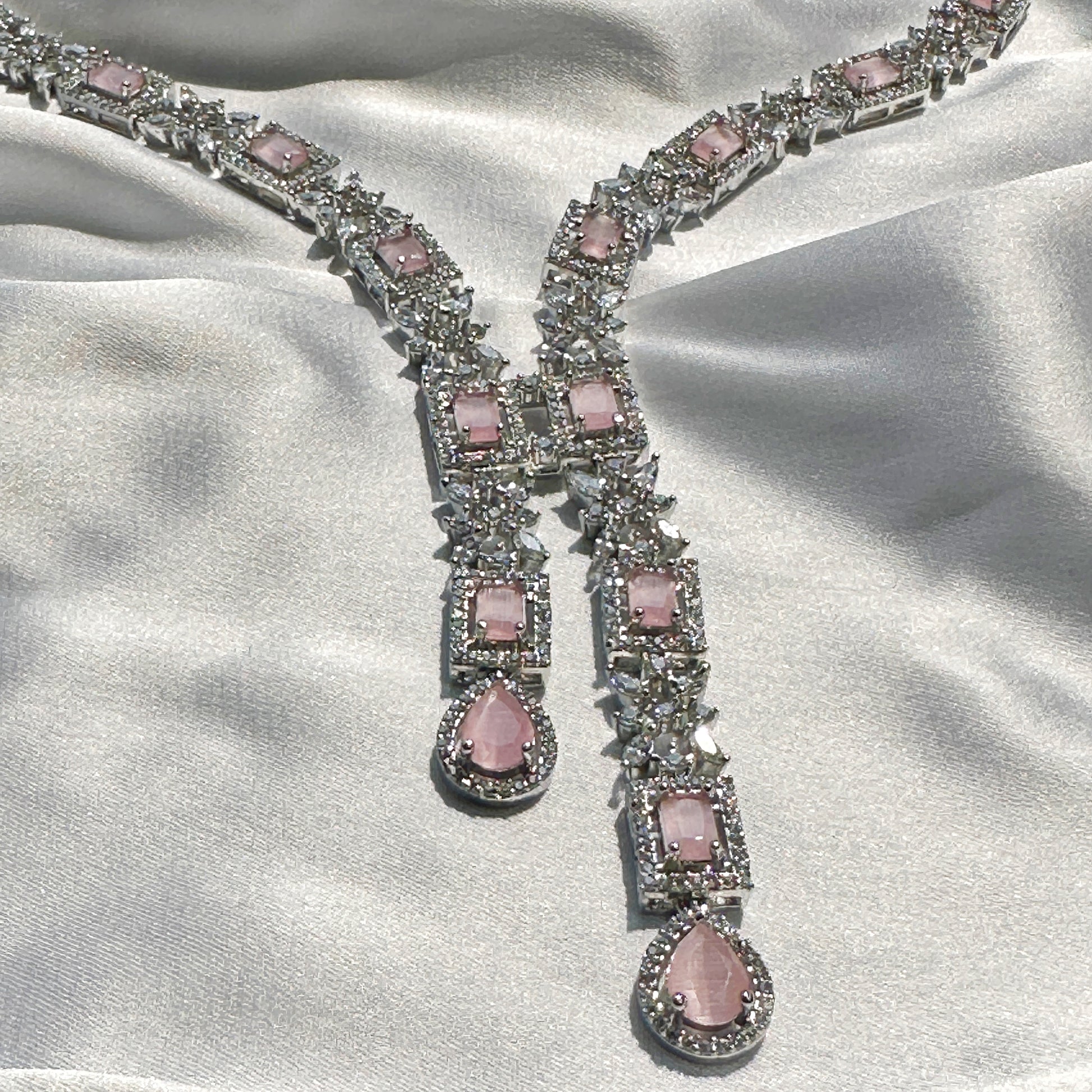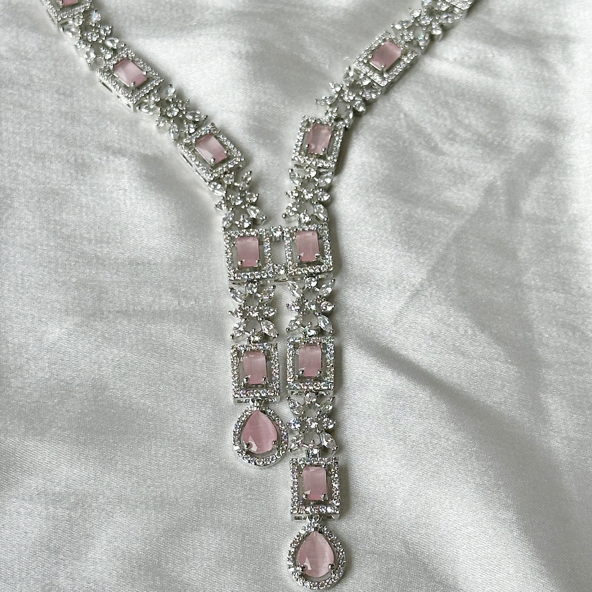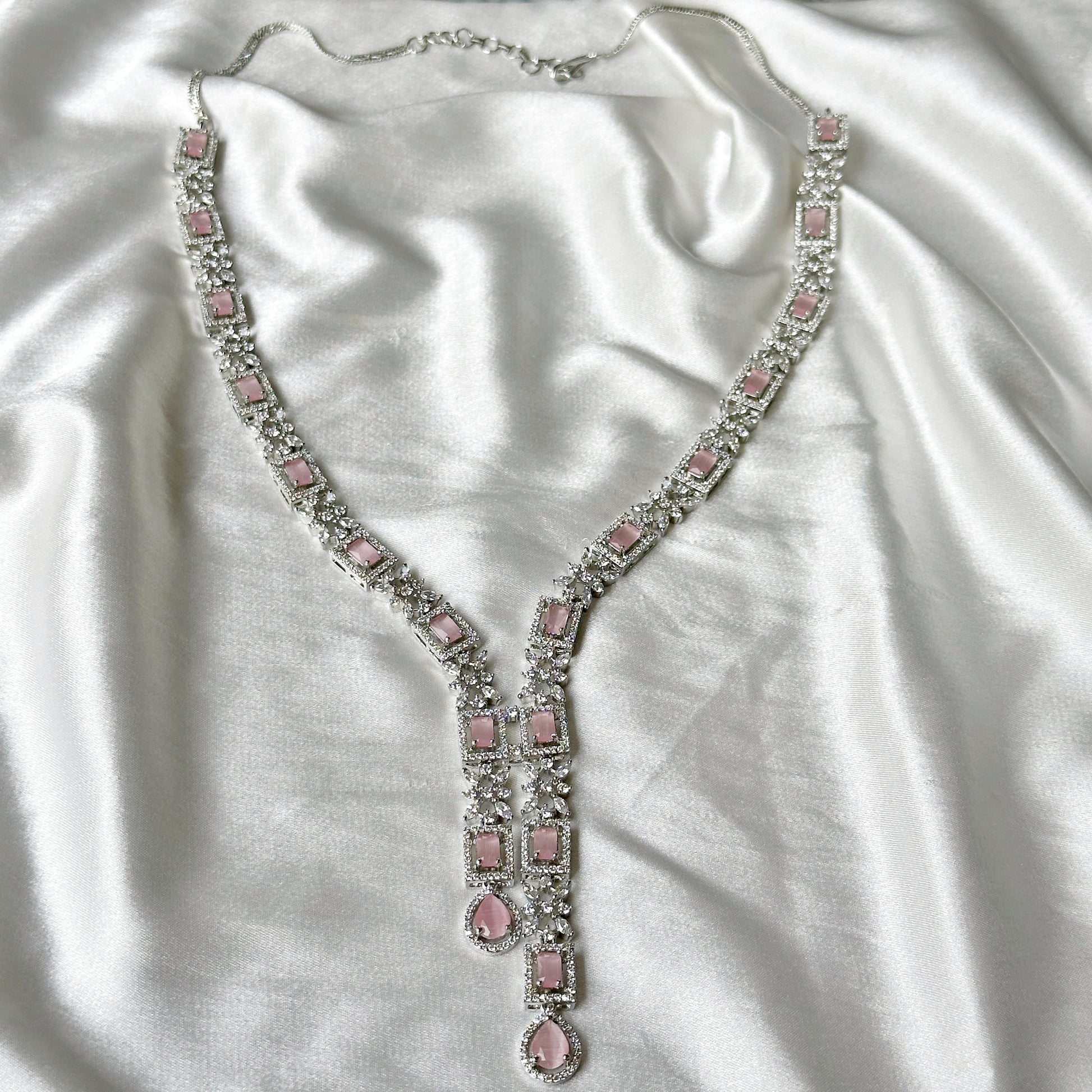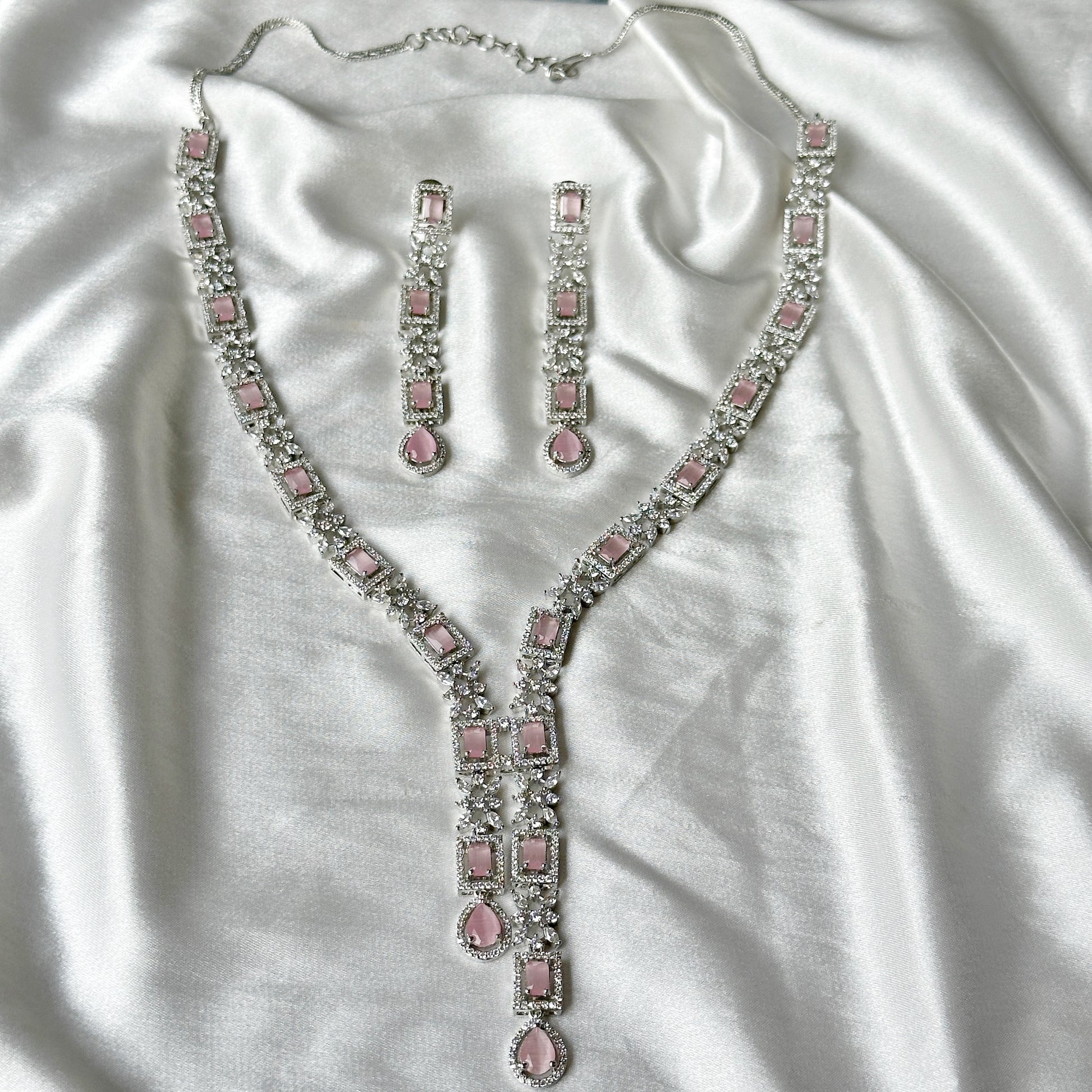 Pink Topaz Cubic Zircon Stones American Diamond Silver Plated Necklace Set