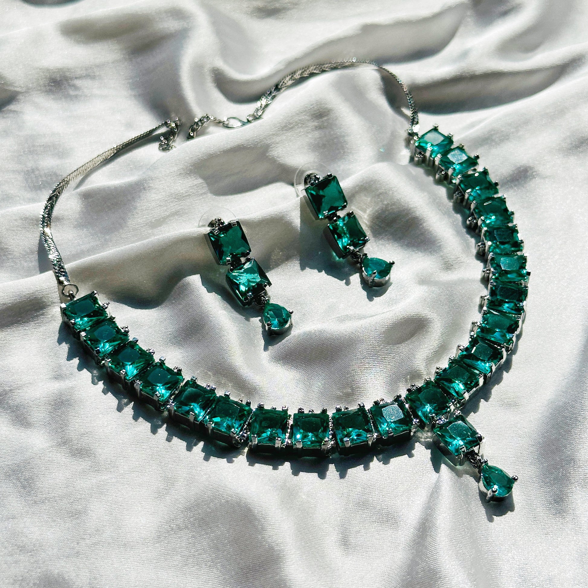 Introducing the epitome of elegance and sophistication, the Ariva Collection presents the stunning American Diamond Silver Plated Necklace Set adorned with exquisite sea green topaz cubic zircon stones. This captivating ensemble is designed to elevate your style and exude an aura of timeless beauty. Crafted with meticulous attention to detail, each shimmering sea green topaz cubic zircon stone is expertly placed to create a mesmerizing pattern that catches the light from every angle. The silver plated chain adds a touch of refinement, enhancing the overall allure of the necklace set. Perfect for any special occasion or a glamorous night out, this necklace set will effortlessly enhance your ensemble and make you the center of attention. The combination of American diamonds, silver plating, and emerald cubic zircon stones creates a harmonious blend of luxury and sophistication. With its exquisite design and impeccable craftsmanship, the Ariva Collection American Diamond Silver Plated Necklace Set is a true statement of elegance. Embrace the allure of this timeless piece and let it become a cherished addition to your jewelry collection.