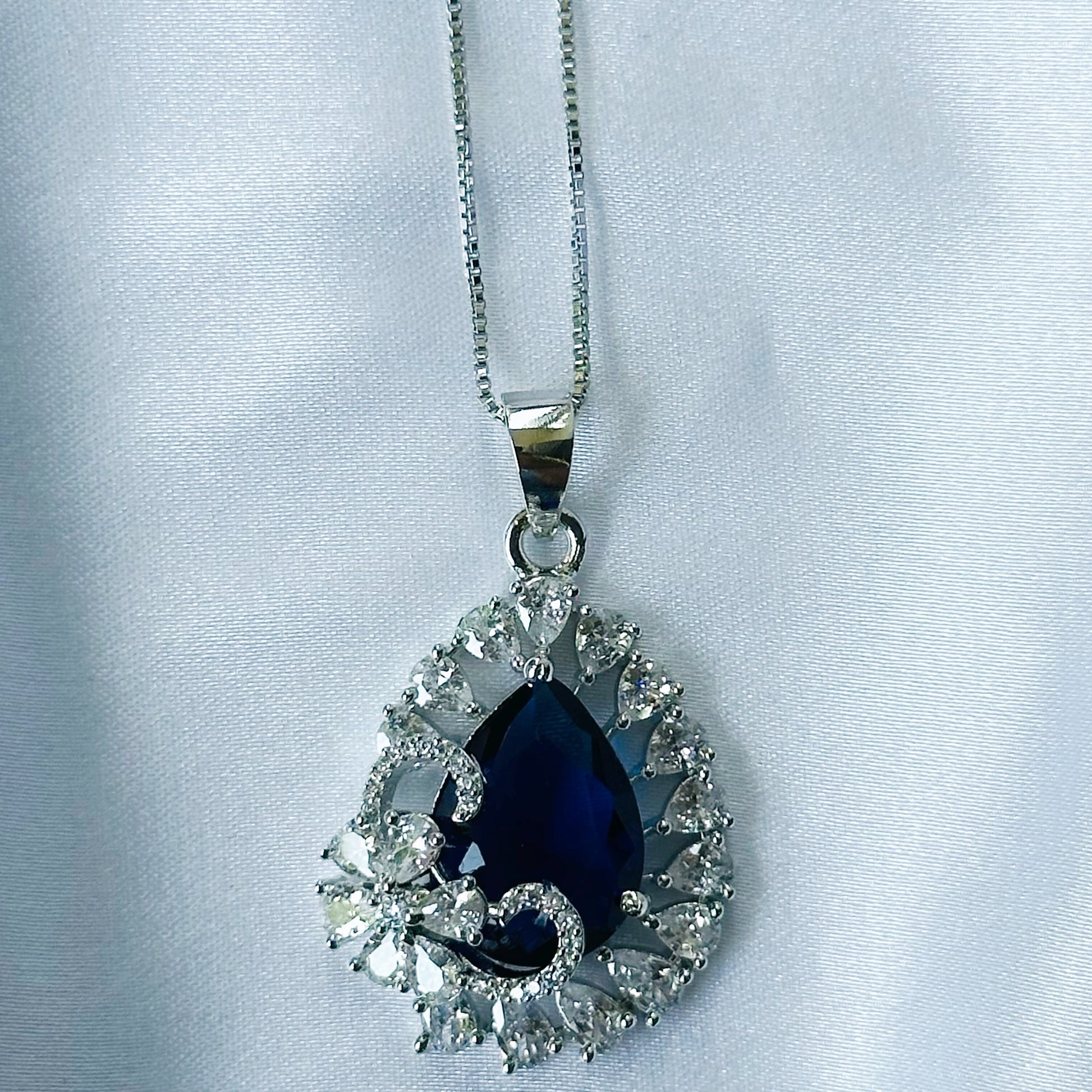Blue Sapphire Cubic Zircon American Diamond Silver Plated Pendant Set