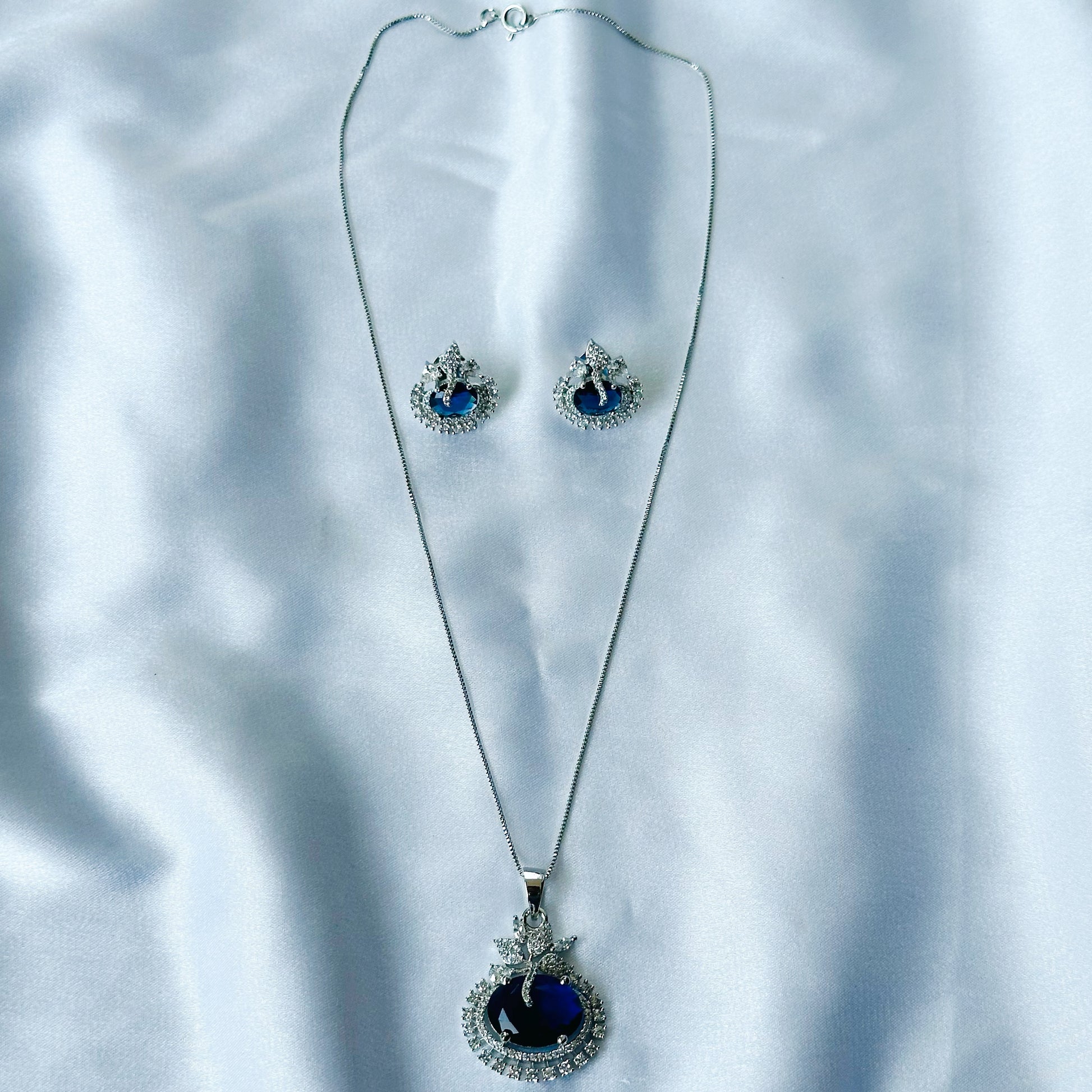Blue Sapphire Cubic Zircon American Diamond Silver Plated Pendant Set