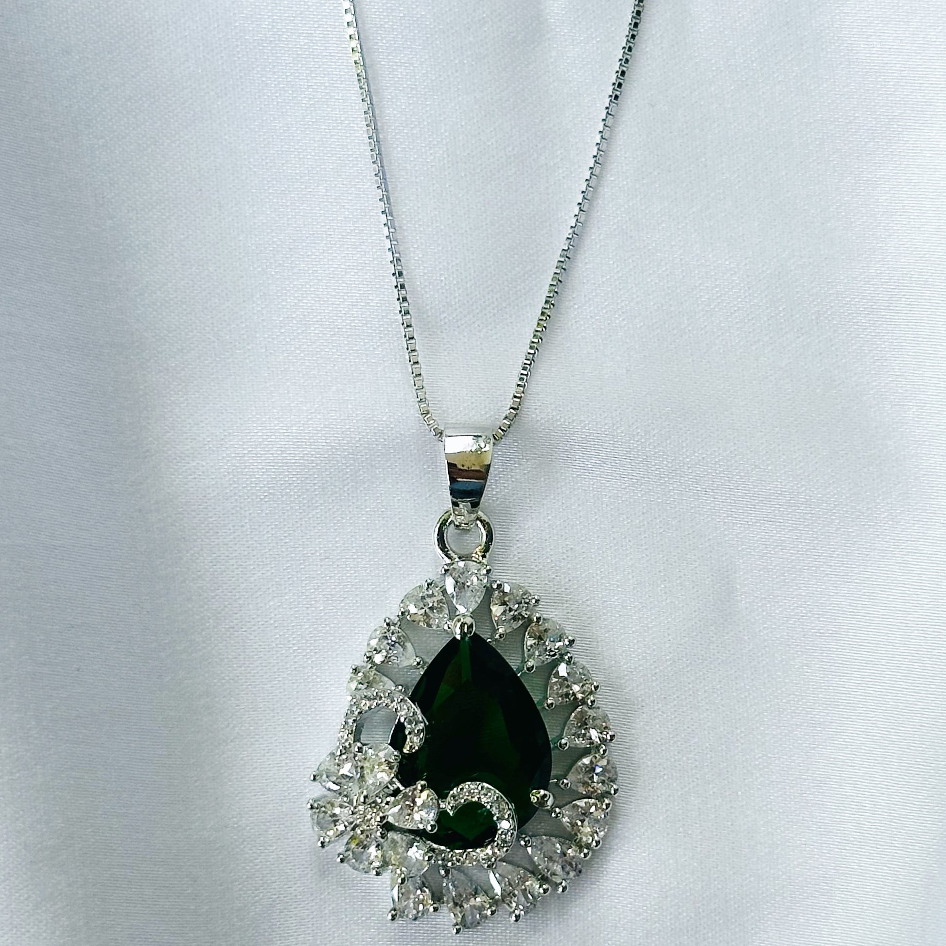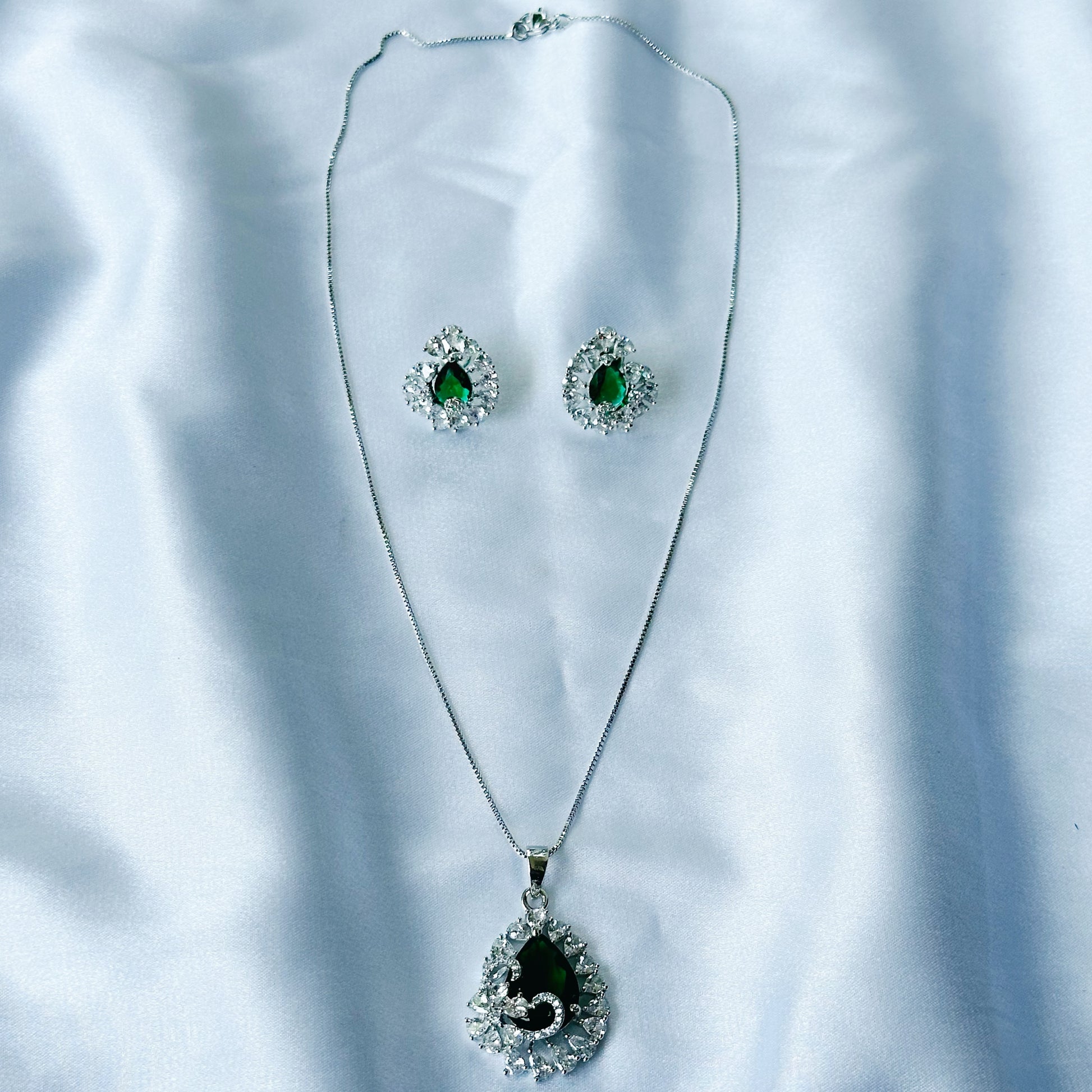 Green Emerald Cubic Zircon American Diamond Silver Plated Pendant Set