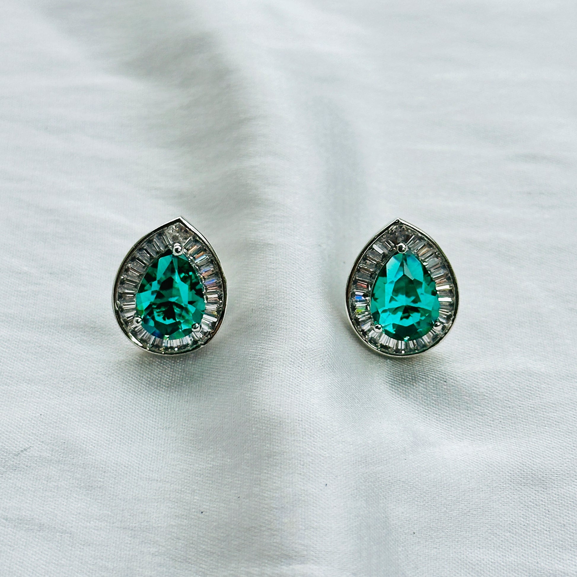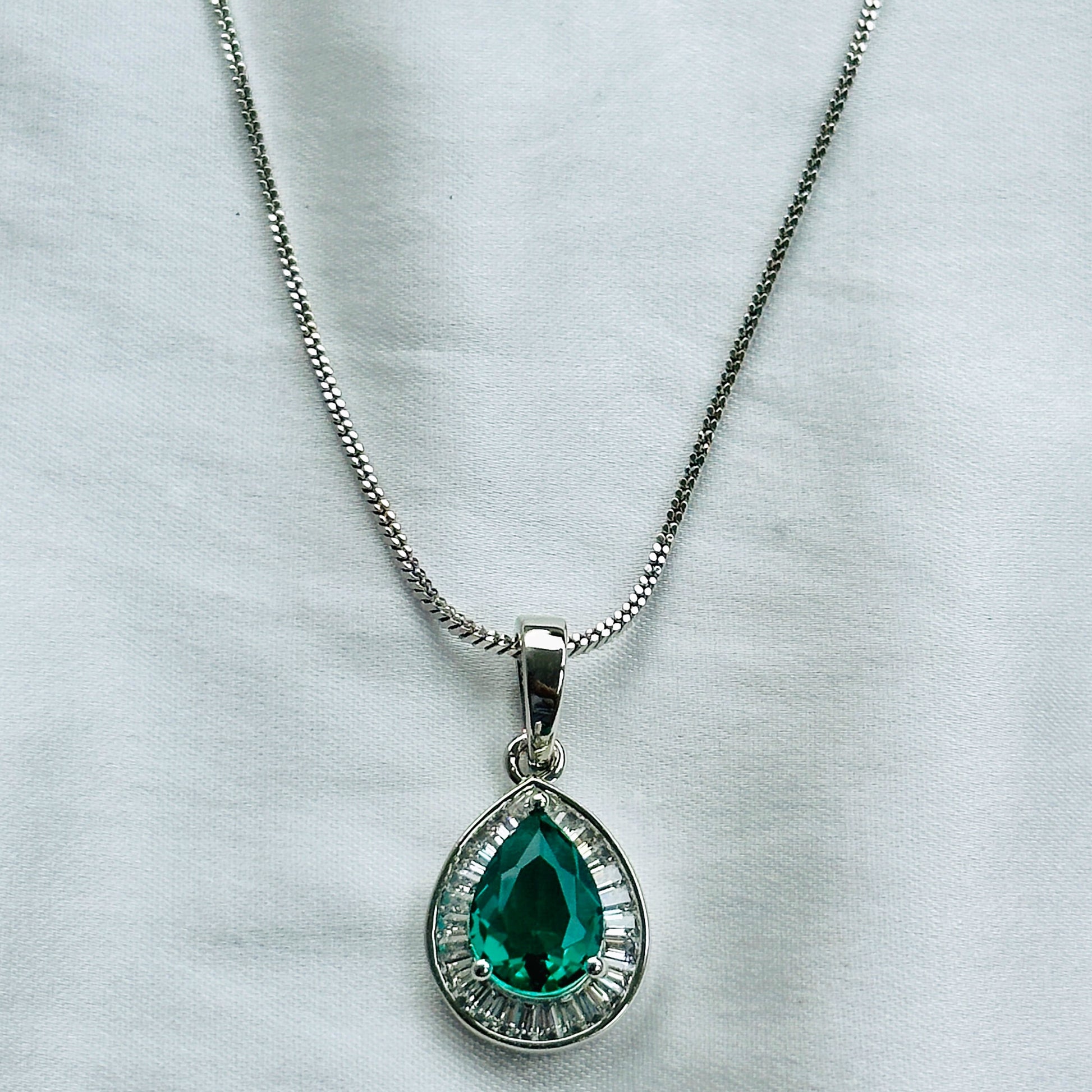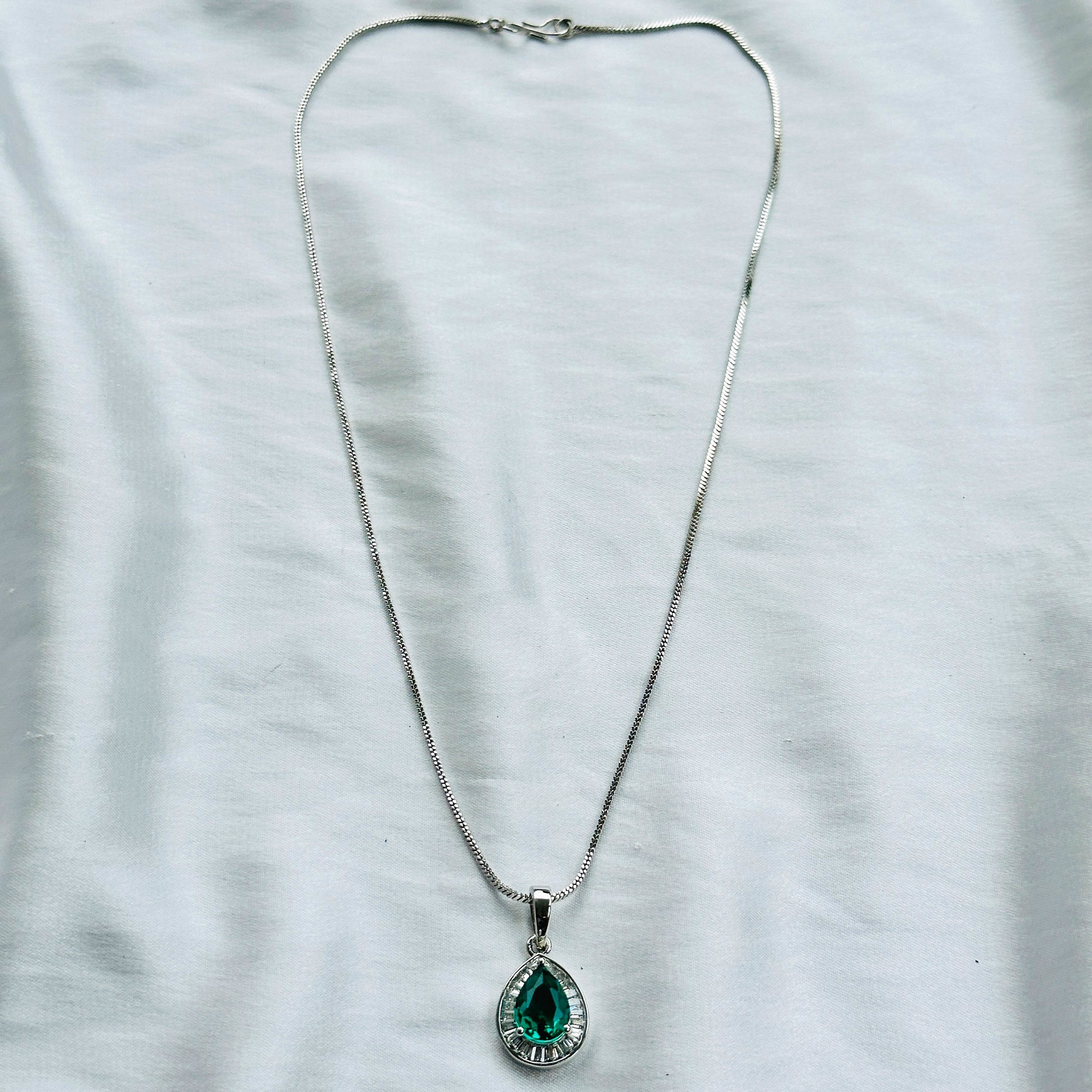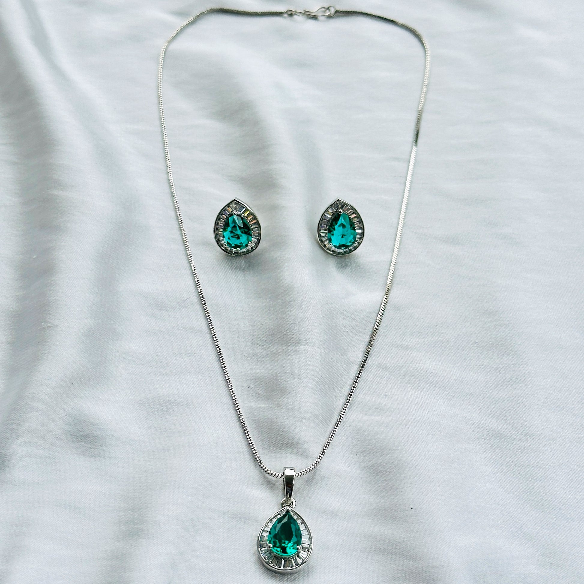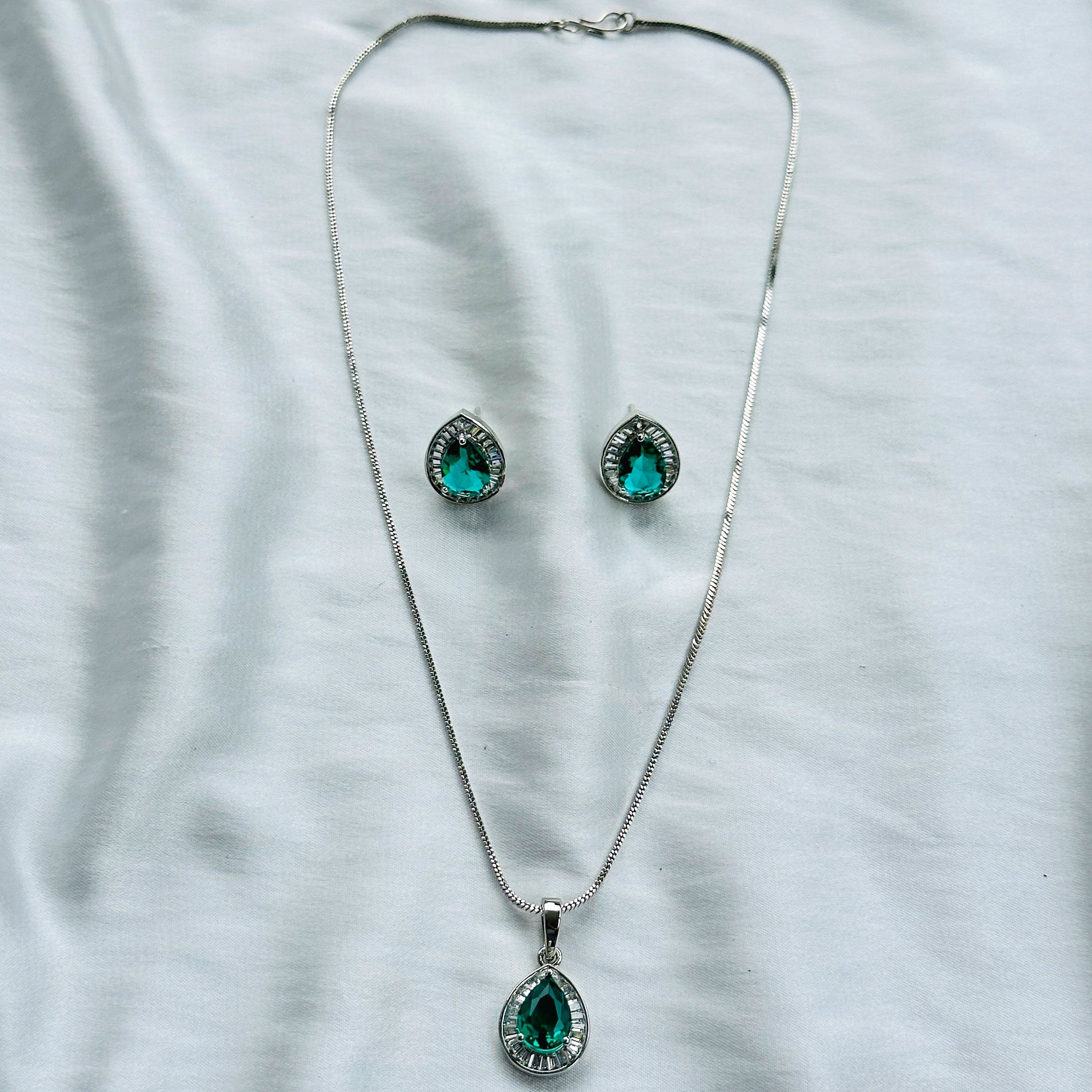 Sea Green Topaz Cubic Zircon American Diamond Silver Plated Pendant Set
