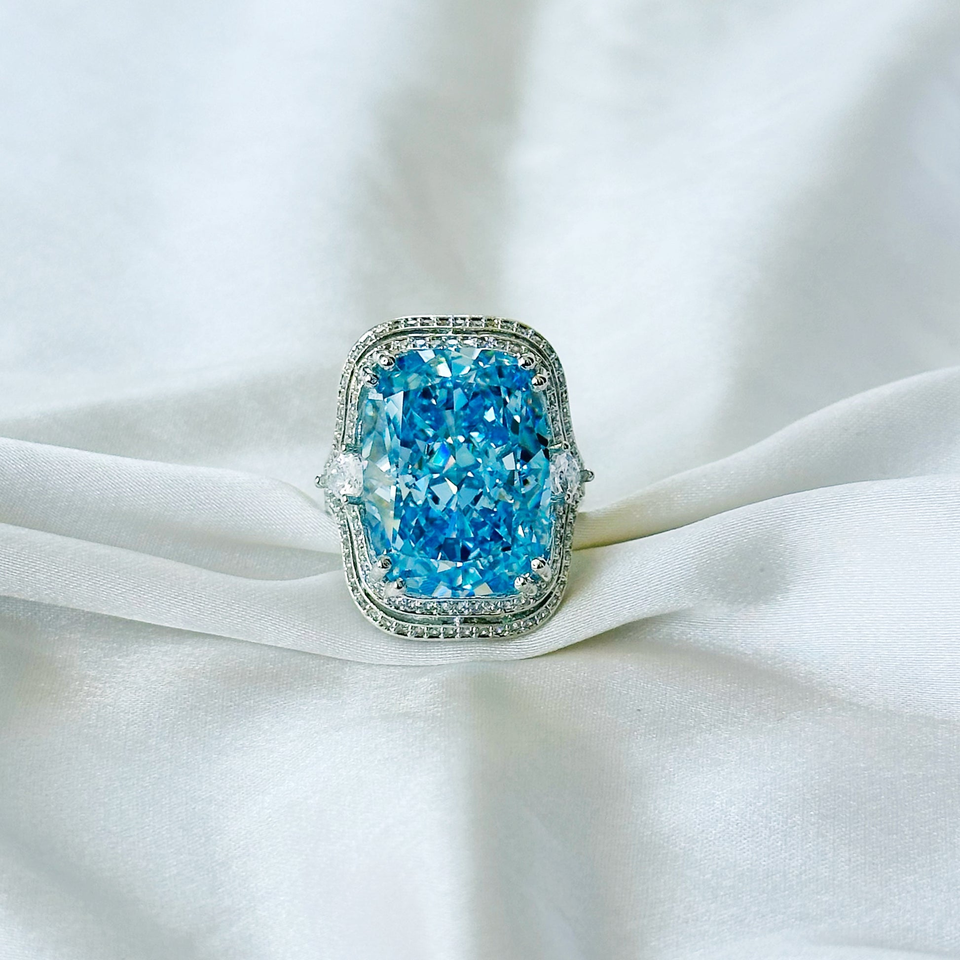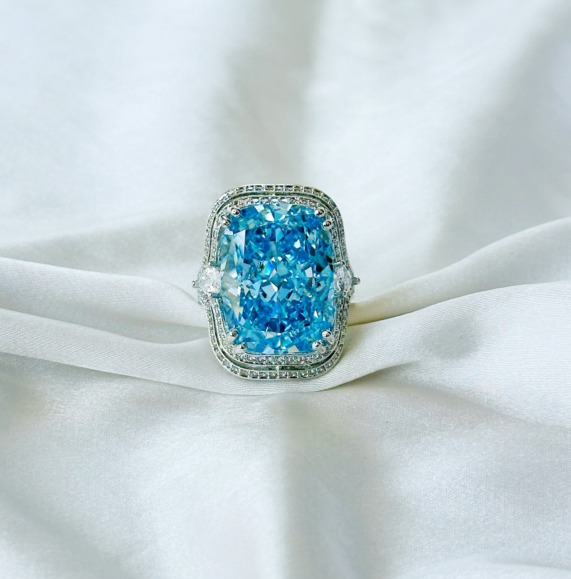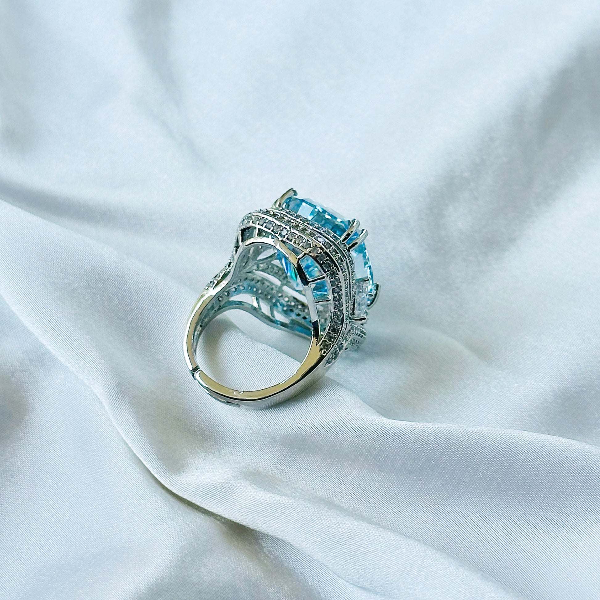 Aqua Blue Sapphire Cubic Zirconia Ice Cut American Diamond Silver Plated Adjustable Ring