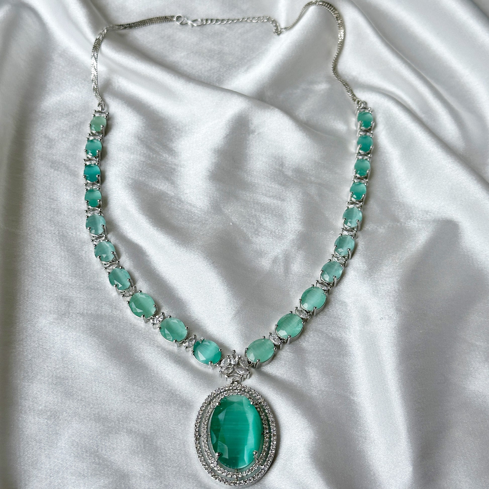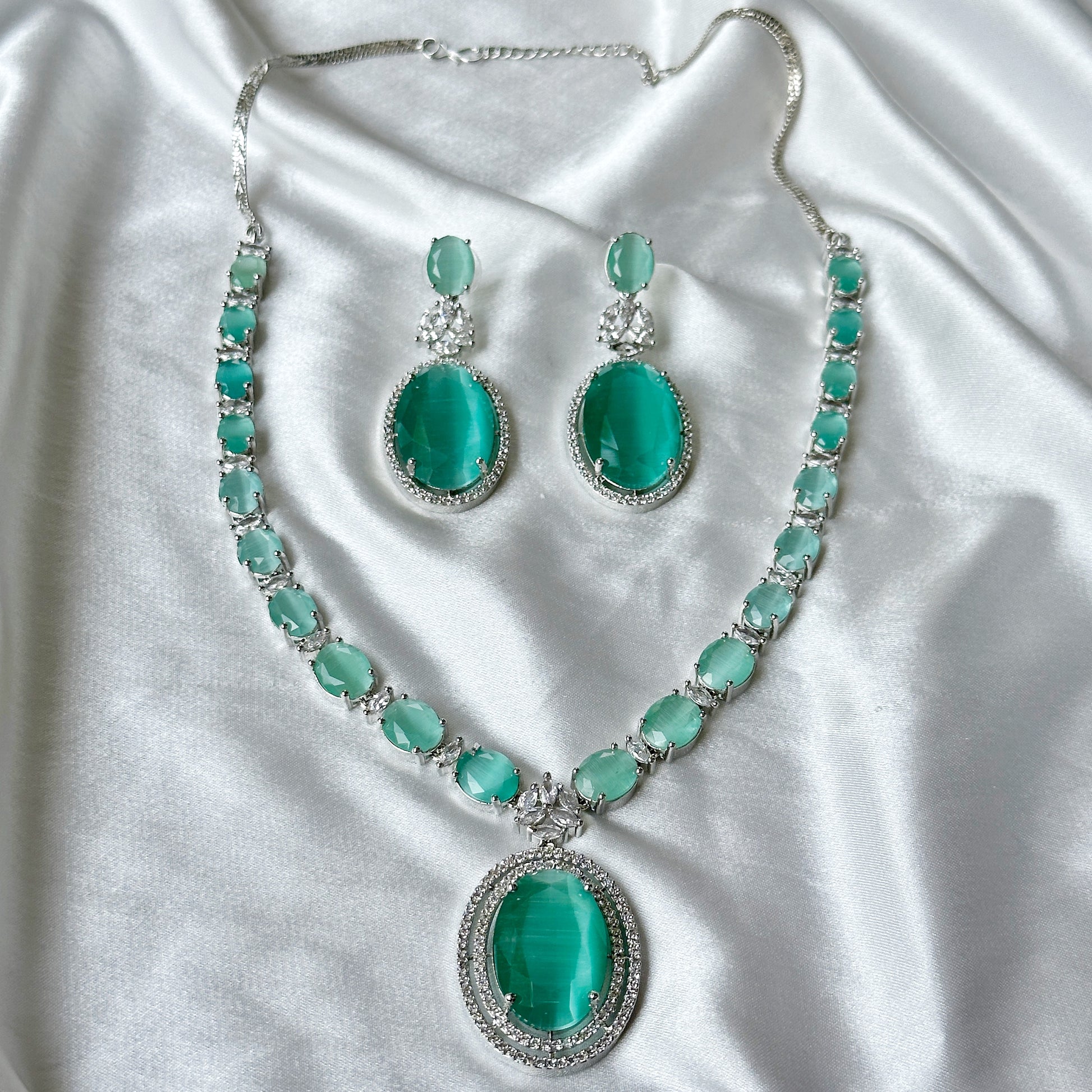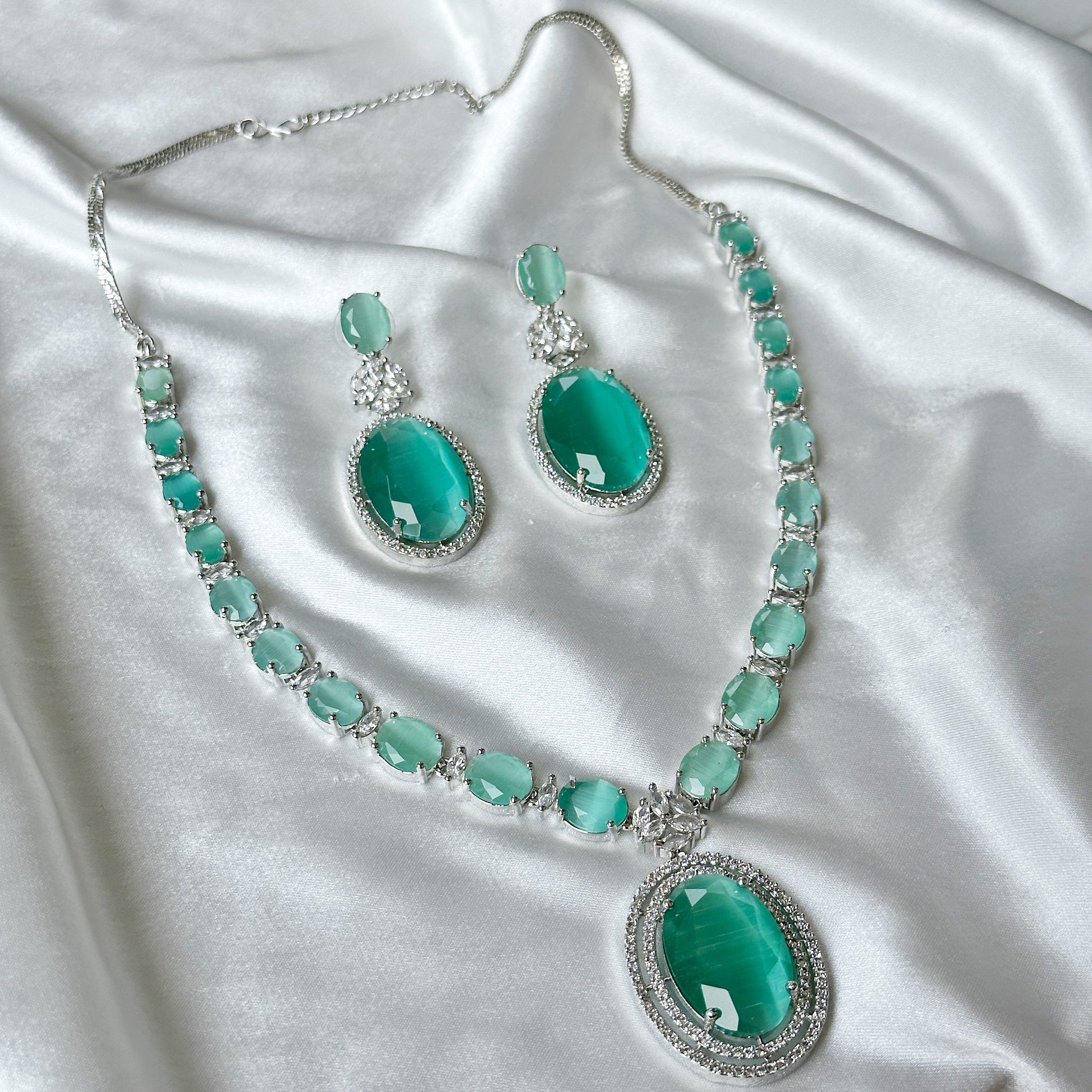 Mint Green Zircon Stone American Diamond Silver Plated Necklace Set