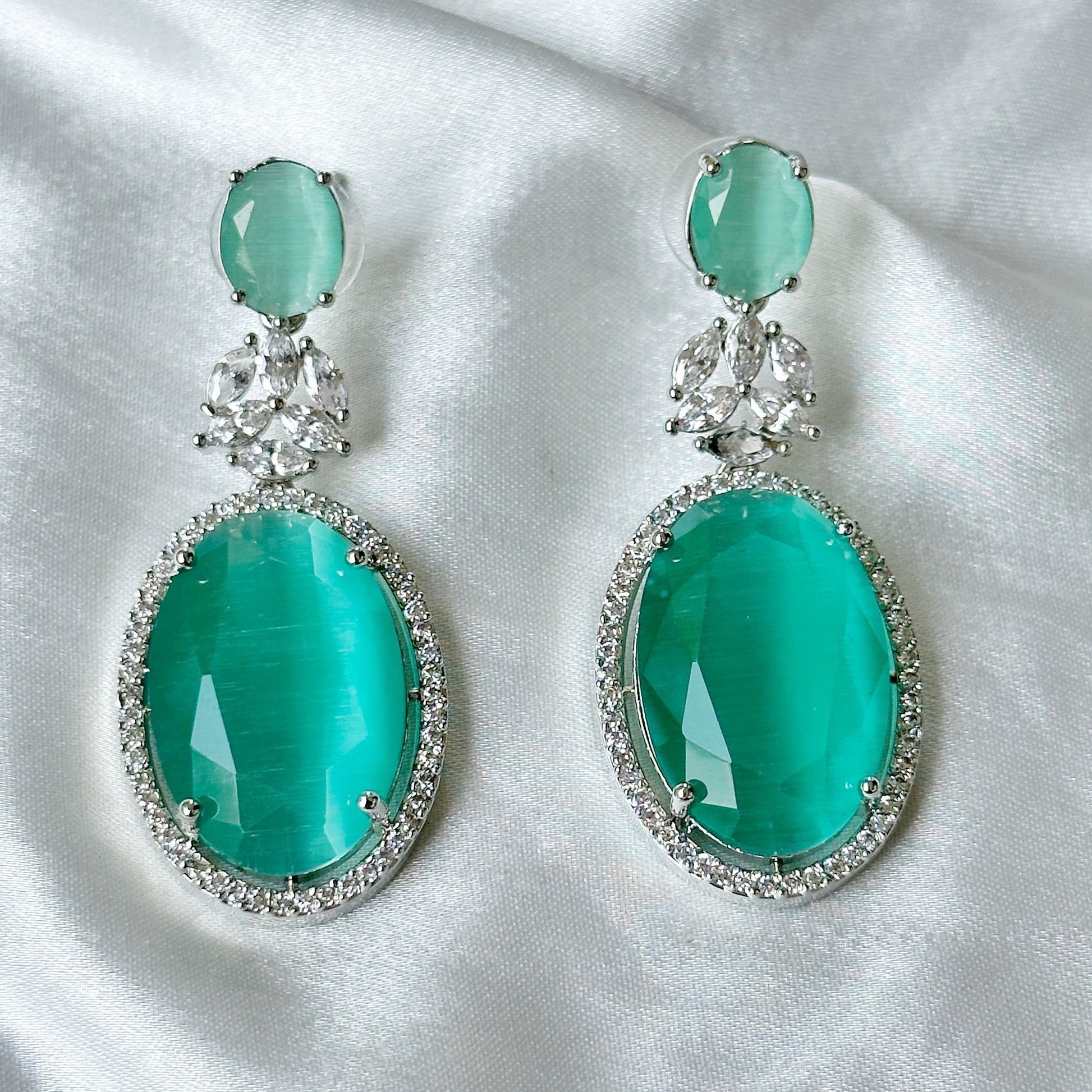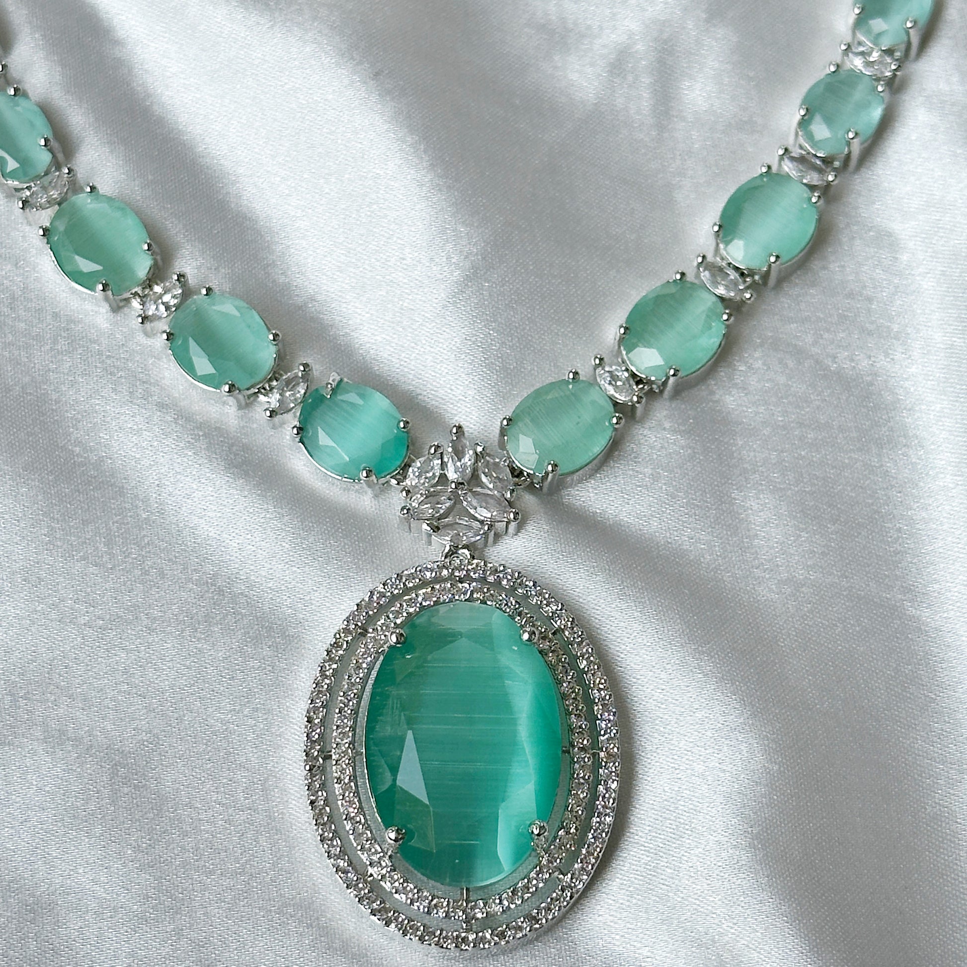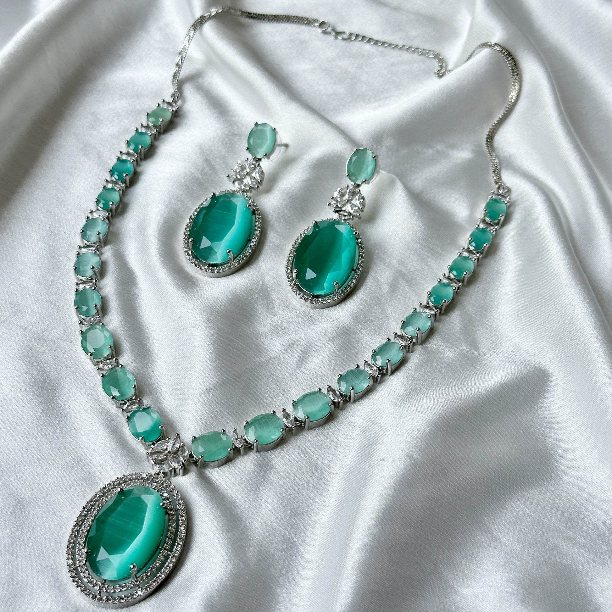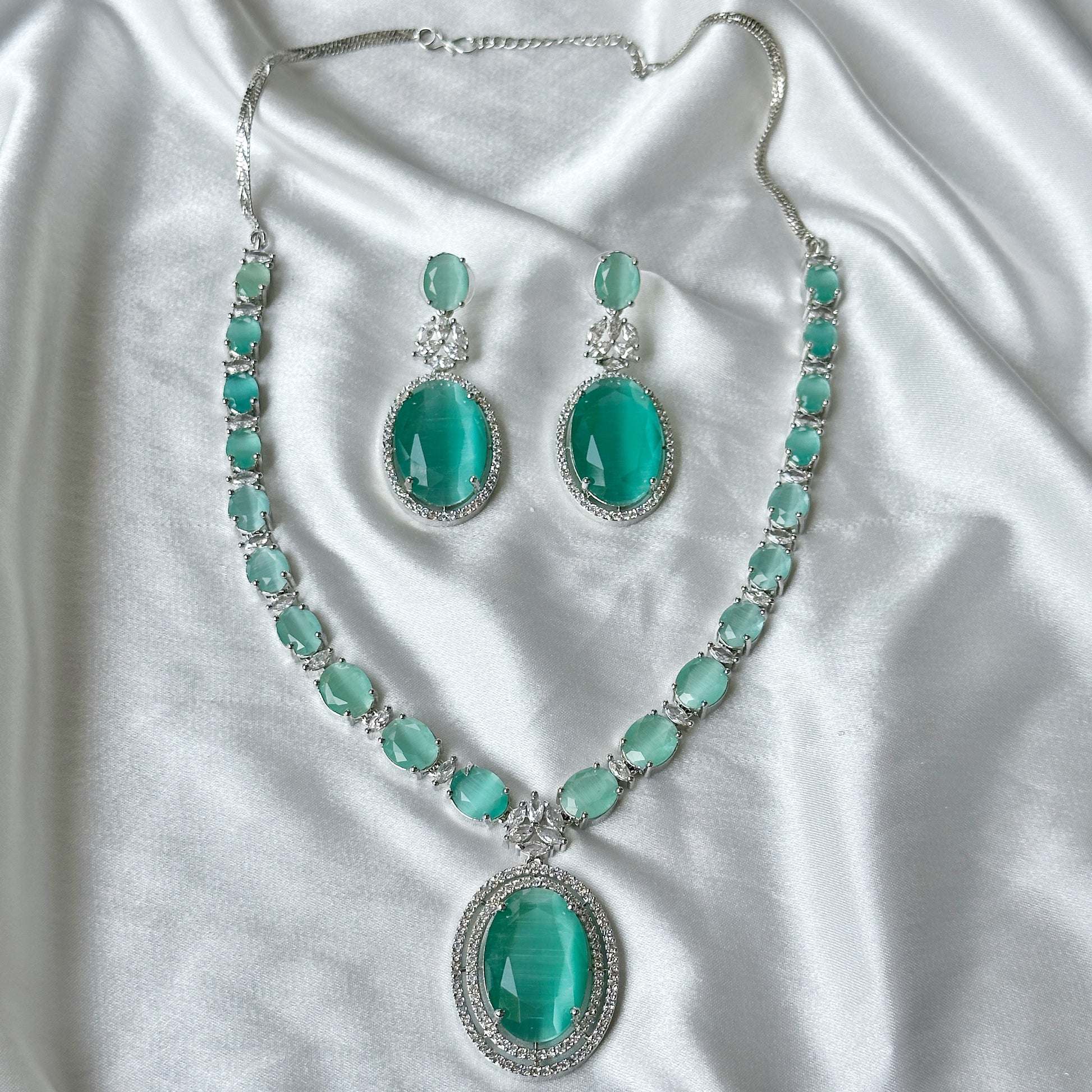 Mint Green Zircon Stone American Diamond Silver Plated Necklace Set